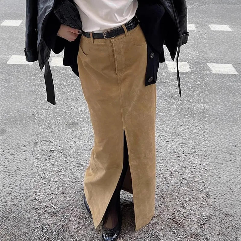 Der Gabrielle Wildlederrock verbindet zeitlose Eleganz mit einem Hauch von Vintage-Charme. Mit seiner hohen Taille, der geraden Silhouette und dem dezenten Gehschlitz ist er der ideale Begleiter für elegante Büro-Looks oder stilvolle City-Outfits im Herbst und Winter 2025 – warm, edel und selbstbewusst feminin.